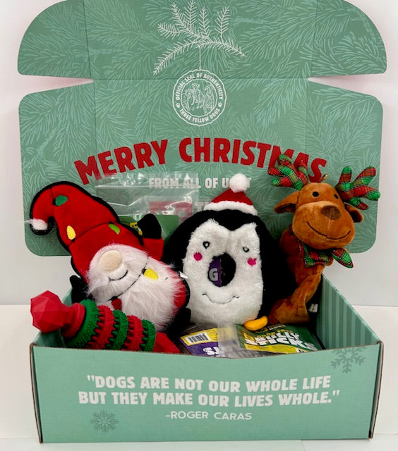 It's the most wonderful time of the year and what could be a more heartwarming way to show your furry family member that you love them than to gift them a Three Yellow Dogs' Christmas box. Each box is filled with at least three hand selected premium Christmas themed dog toys and three bags of delicious, all natural dog treats. We love our dogs and treat them like family, we know you do too.