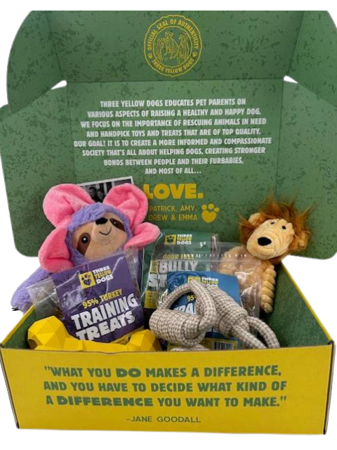 Three Yellow Dogs' introductory box is filled with three hand selected premium dog toys and three bags of delicious, all natural dog treats. All of our toys have been put to the test and our treats contain limited ingredients and are never treated with chemicals. If we wont give something to our dogs we won't give them to yours. It's that simple.